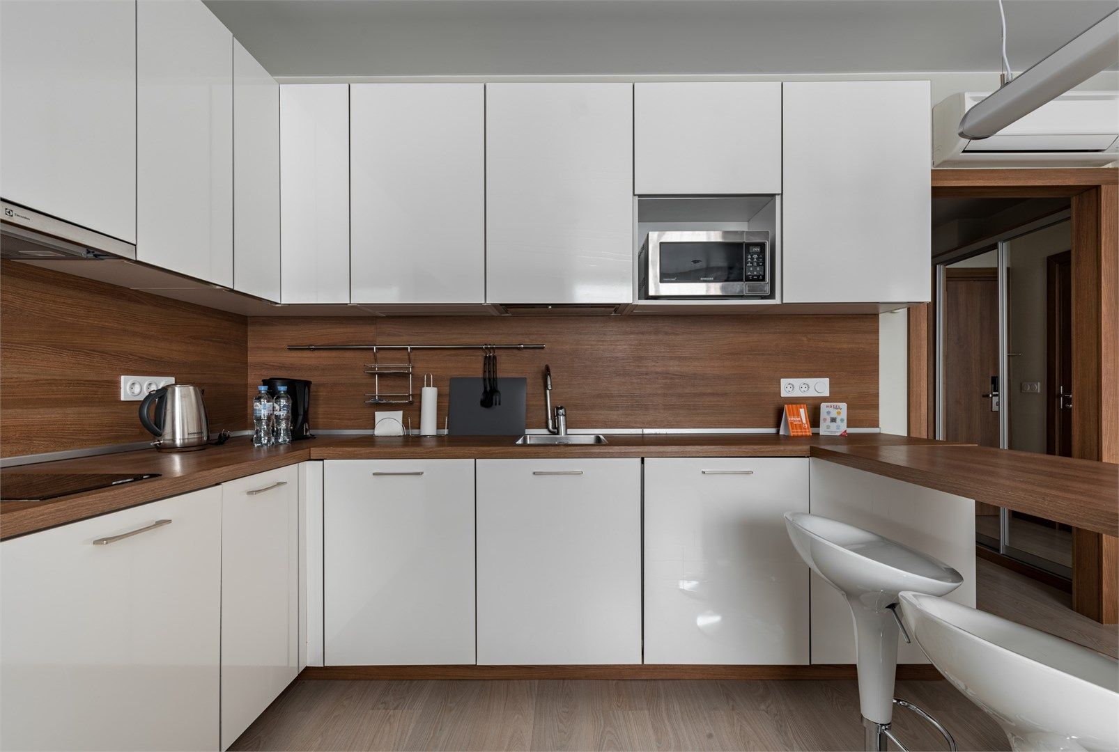 Апартаменты категории Superior идеально подойдут для проживания 1-2 человек. Интерьеры апартаментов выполнены в спокойных бежево-коричневых тонах. Кухня оснащена встроенной бытовой техникой от ведущих европейских производителей: микроволновая печь, холодильник, керамическая варочная панель, стиральная машина. В обеденной зоне располагается стол на несколько персон и комфортабельные смарт-стулья, ...