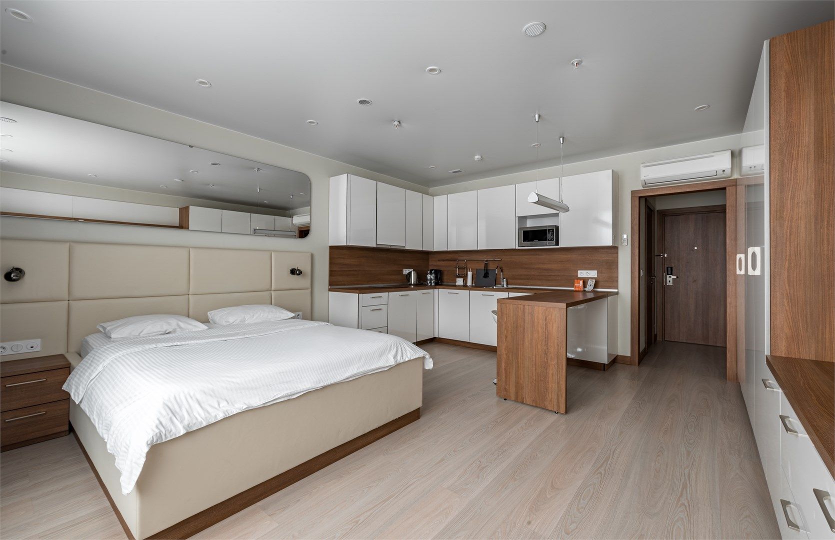 Апартаменты категории Superior+ идеально подойдут для проживания 1-2 человек. Интерьеры апартаментов выполнены в спокойных бежево-коричневых тонах. Кухня оснащена встроенной бытовой техникой от ведущих европейских производителей: микроволновая печь, холодильник, керамическая варочная панель, стиральная машина. В обеденной зоне располагается стол на несколько персон и комфортабельные смарт-стулья,...