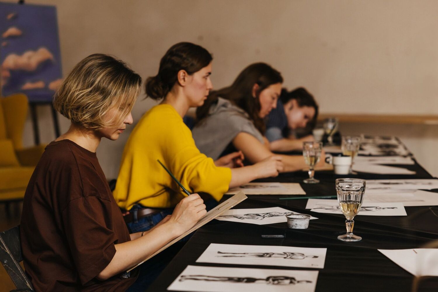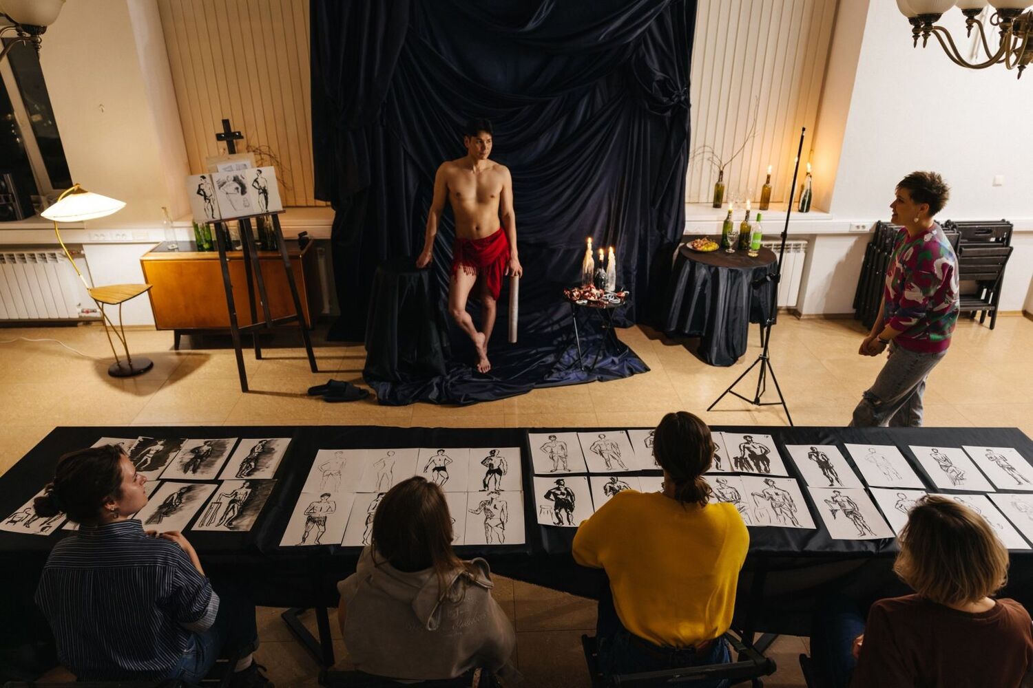 Вечер начинается с бокала вина в уютной полутемной студии при свечах. Ведущий художник настраивает компанию на творческий лад, объясняет принципы работы с натурой: как ловить характер позы, передавать настроение модели и игру света и тени на поверхности обнаженного тела. В центр зала выходит натурщик или натурщица — и начинается магия. Гости делают серию быстрых набросков углем, сепией или карандашом, меняя ракурсы и материалы. Между зарисовками — паузы с вином и фруктами, легкие обсуждения, смех и поддержка художника. Нет правильного или неправильного рисунка — есть только процесс, драйв и удовольствие от каждого штриха. В конце вечера каждый уносит с собой серию своих авторских набросков — живых, острых и очень личных.