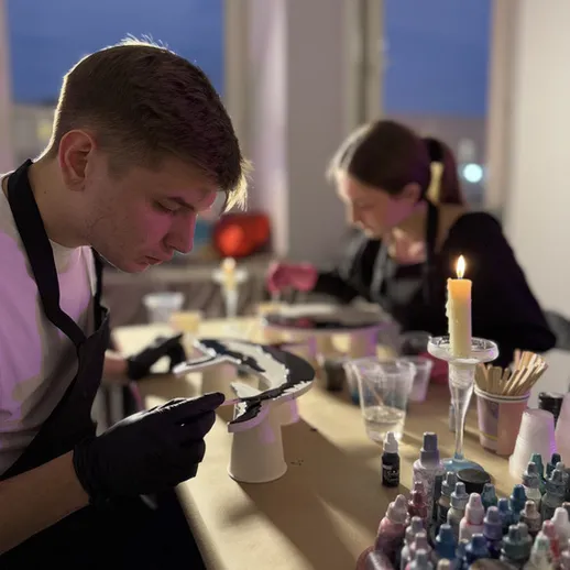 Пригласите свою половинку на незабываемое свидание - мастер-класс по эпоксидной смоле, где романтика будет во всем! Мы создадим для вас особенную атмосферу: мягкий свет свечей и приятная музыка - все, чтобы этот вечер стал по-настоящему волшебным.
