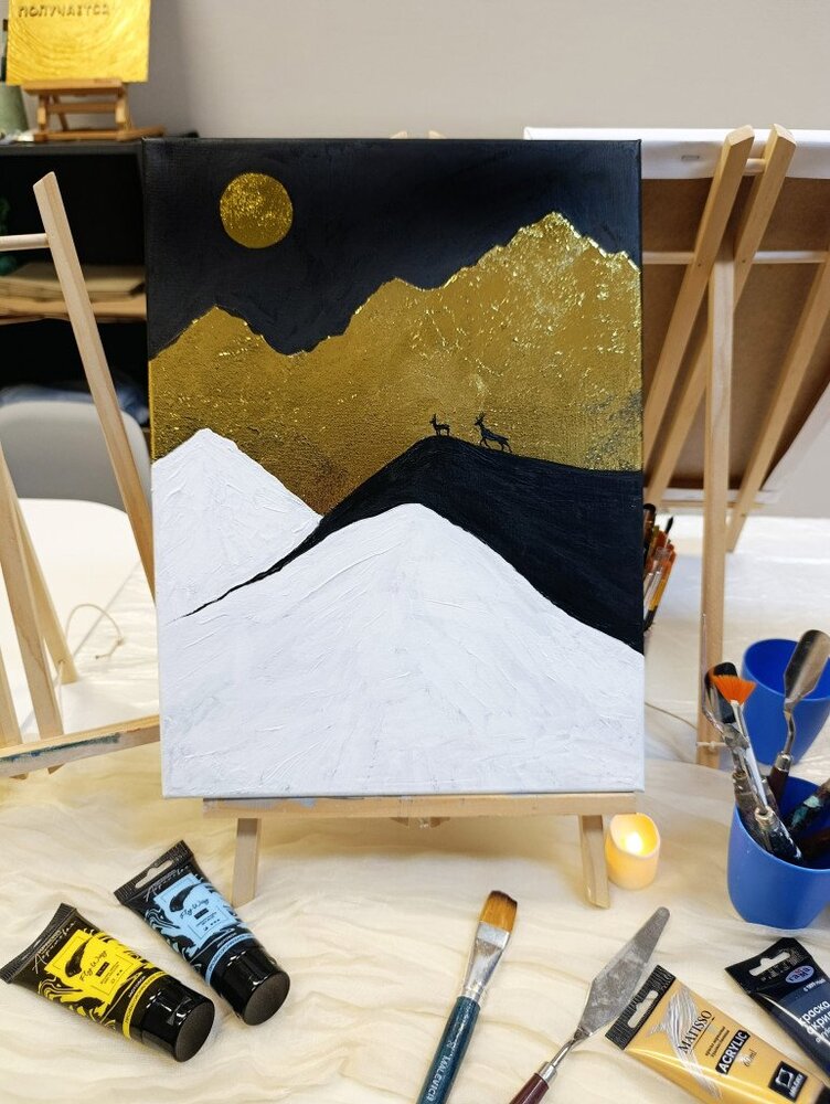 Картина выполняется на холсте 30х40 см, акриловыми красками + можно сделать с текстурной пастой или поталью.