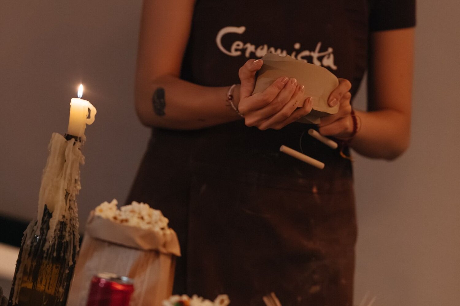 Мастер-класс начинается с тёплого приветствия и погружения в атмосферу кино и керамики. Первые полчаса мастер рассказывает, как из обычного куска глины рождается ваша уникальная вещица — вы выбираете форму (кружка, тарелка или боул) и под его чутким руководством создаёте основу. А затем начинается самое интересное: на экране включается фильм, а в ваших руках оказываются кисточки и ангобы. Вы продолжаете лепить и раскрашивать своё изделие, параллельно жуя попкорн, наслаждаясь напитками и погружаясь в сюжет. Мастер всегда рядом, помогает с формой и декором. Весь вечер проходит в лёгкой, вдохновляющей атмосфере — никакой спешки, только творчество, кино и удовольствие. После мастер-класса ваше изделие отправляется на обжиг (это занимает 5 недель), и вы забираете домой полностью готовую к использованию керамику.