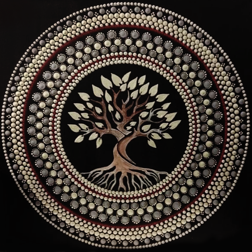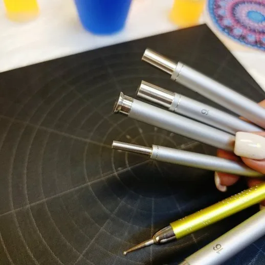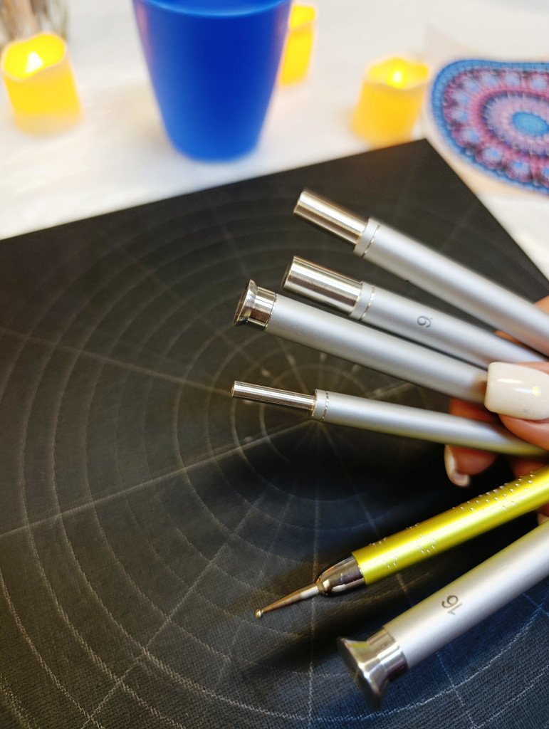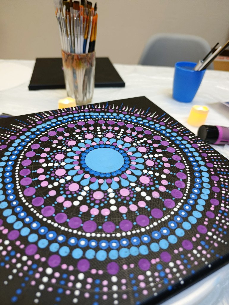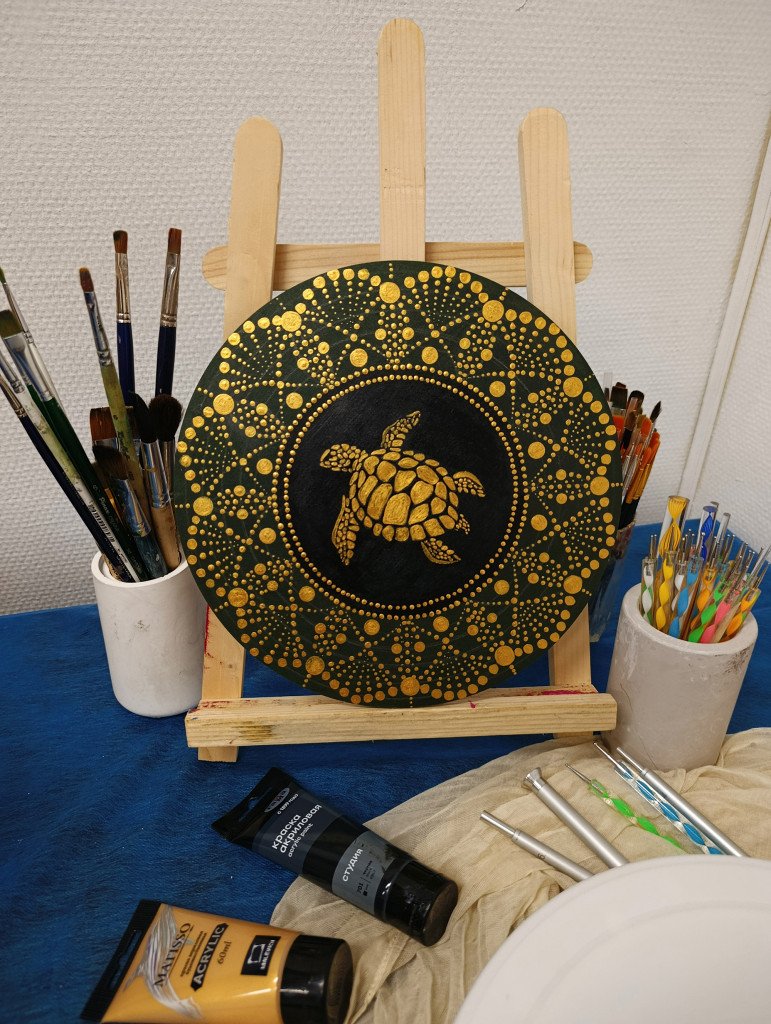 Мандала выполняется на круглом арт-борде или на холсте (25 см), при помощи художественных инструментов для точечного рисования (дот арт). Рисунок выполняется акриловыми красками.