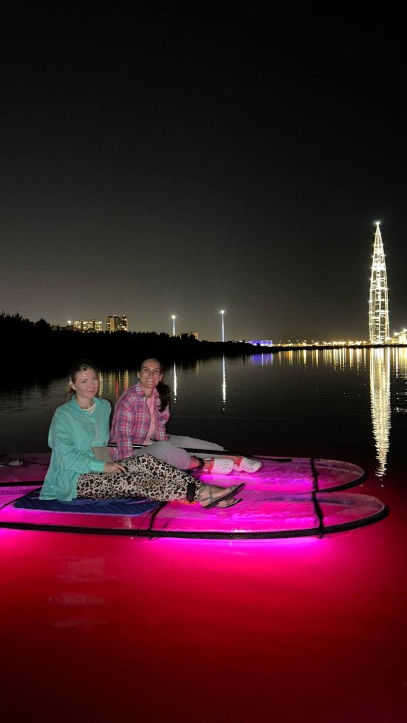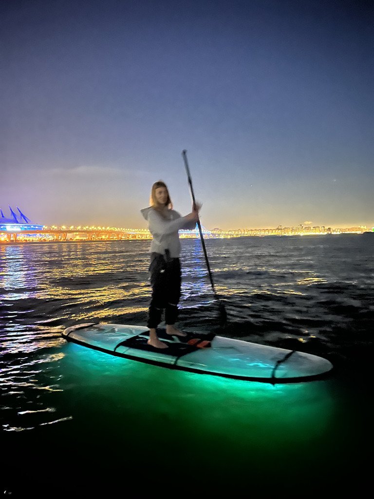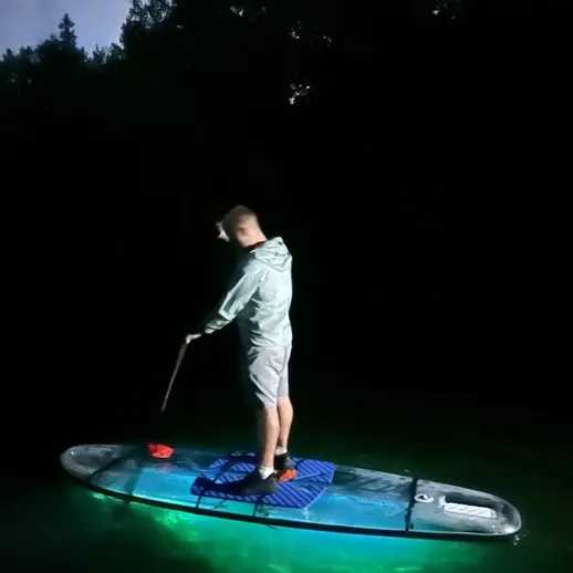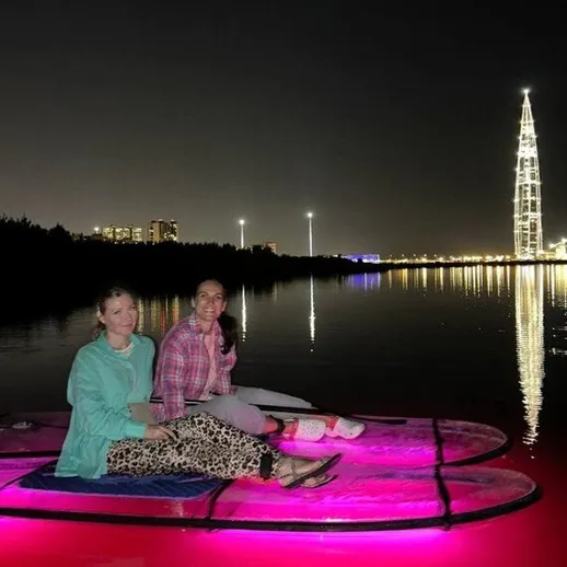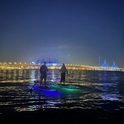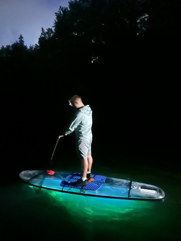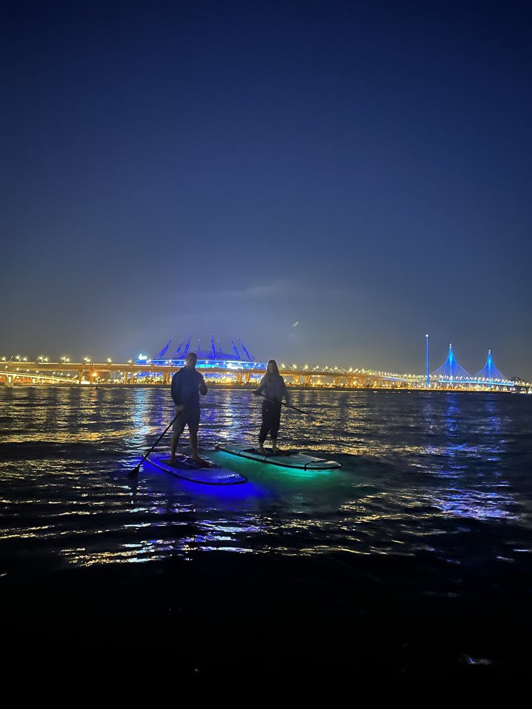 Гладкая водная гладь, мерцание подсветки сапбордов и спокойствие ночи создают уникальную атмосферу. Участники могут управлять цветом подсветки своих досок, настраивая настроение прогулки.