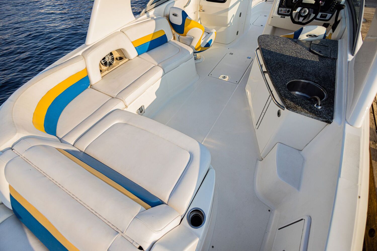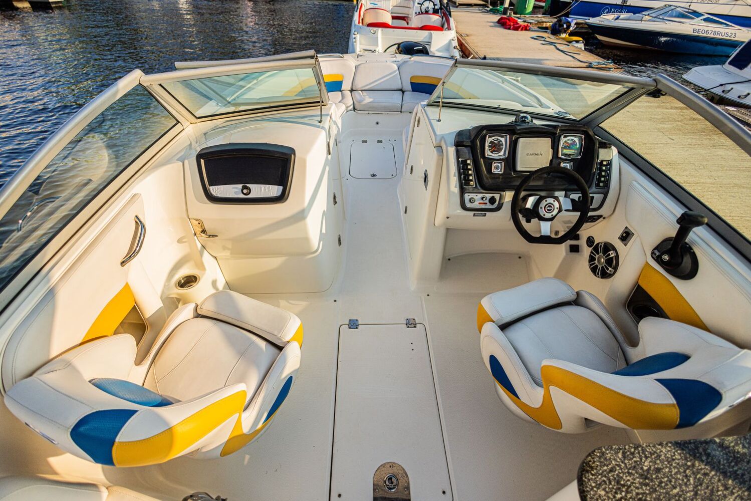 - Просторные мягкие диваны в кокпите и открытой носовой части, стол и подстаканники для напитков, комфортный туалет на борту