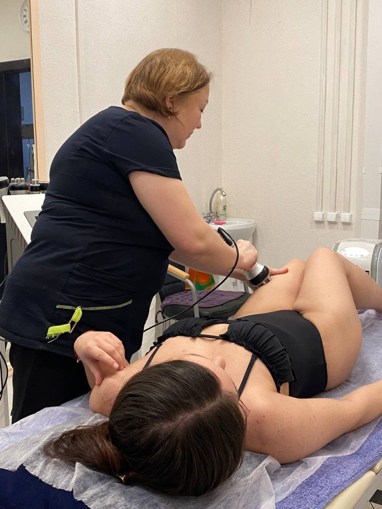 Чтобы усилить результаты, специалист добавляет ручной антицеллюлитный массаж, который основывается на механическом воздействии на кожу с использованием определённых техник. Это помогает улучшить обмен веществ в подкожно-жировом слое.
