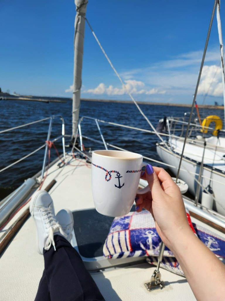 Встретить новый день с кофе на яхте в море - это прекрасно.