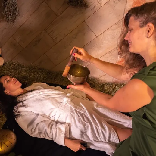 Добавь себе удовольствия: на теплом сеновале после расслабляющих процедур для вашей души и тела проведут терапию на поющей тибетской чаше, ханге и глюкофоне.